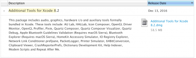 ダウンロードページはXcodeのOpen Developer Tool → More Developer Tools… から飛ぶのが一番早いでしょう。Developer Centerのダウンロードページに飛びます。 検索条件に「for Xcode」が入った状態でリストが出てくるので、絞込見直すか、ブラウザの検索機能で「Additional Tools for Xcode 8」を探すといいでしょう。